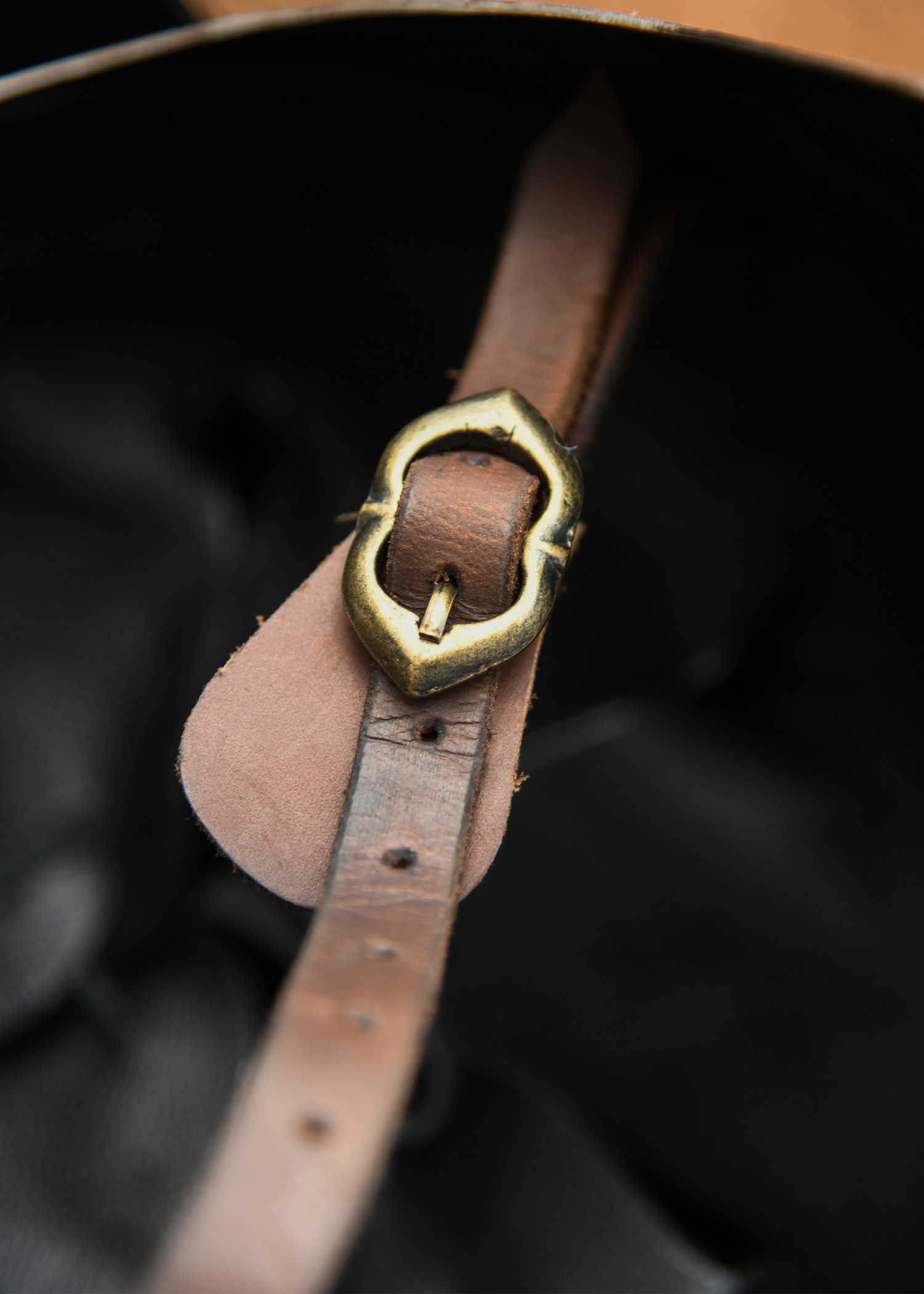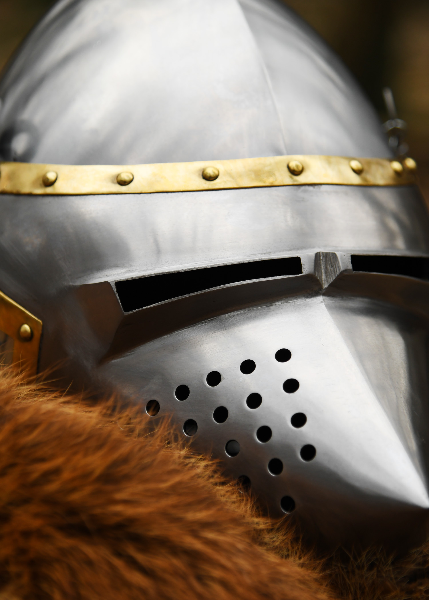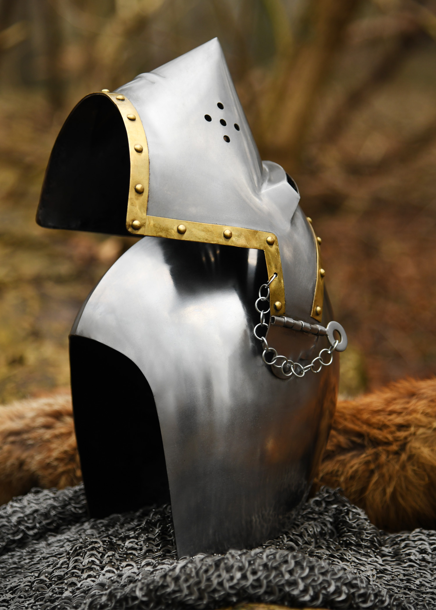 Unser Helm basiert auf einem mailändischen Helm um 1390 n. Chr., hergestellt aus aufwendig gearbeitetem und vernietetem Rüstungsstahl mit Messingverzierungen.