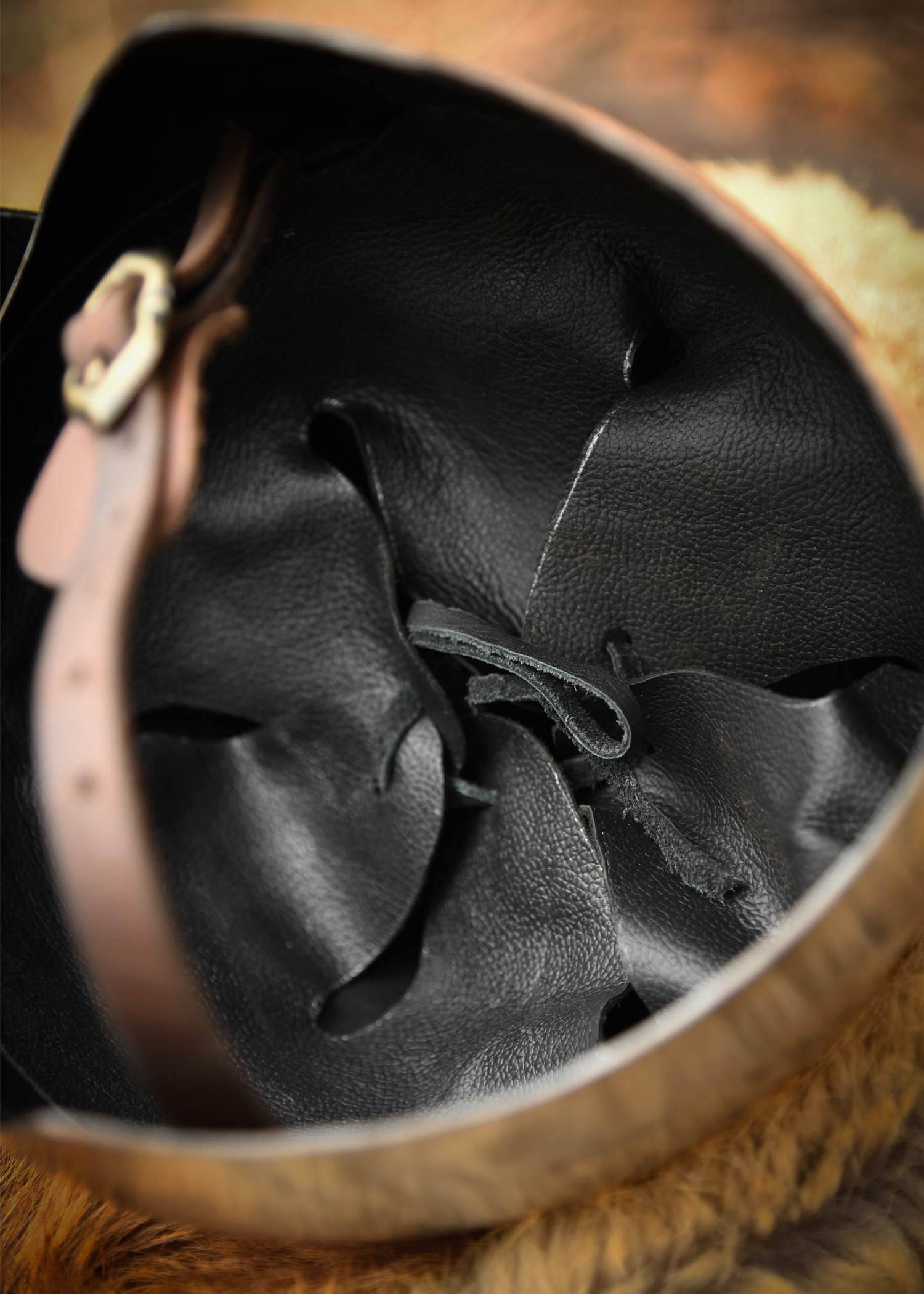 Der Helm besitzt ein bewegliches, abnehmbares Visier und hat ein komfortables Lederinlett sowie einen Kinnriemen aus Leder.