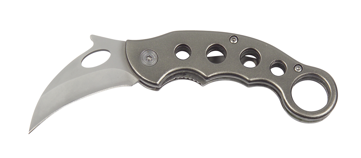 Taschenmesser mit einer gebogenen Klinge haben eine erstaunliche Schnittleistung. Diese Klingen, welche bei Gärtnern schon lange bekannt sind, schneiden durch fast alles wie durch Butter. Die Klinge des feststellbaren Taschenmessers ist aus 420 rostfreiem Stahl gefertigt und öffnet blitz schnell durch Federunterstützung. Durch den Ring am Ende des Griffes kann man nicht vom Griff abrutschen und das Messer liegt sicher in der Hand. Die Griffbeschalung ist aus Leichtmetall und verfügt über einen Gürtelclip.
